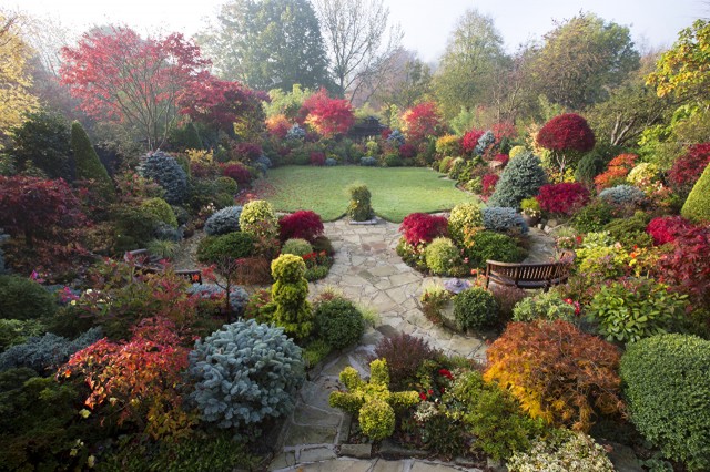 In this garden the large rounded and domed cherry tree is replicated in the shape of the pond (image 1) and the stone arch (image 2).